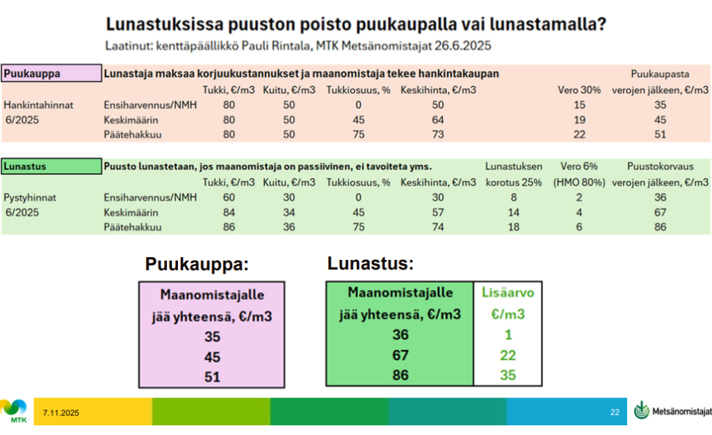 Uuden lunastuslain myötä on mahdollista neuvotella asianmukainen korvaus esim. sähkölinjalta poistettavalle puustolle. Ei välttämättä kannata tehdä toimijan kanssa puustosta sopimusta hankintahinnalla. Metsäasiantuntijamme auttavat mielellään, mikäli asia tulee ajankohtaiseksi.